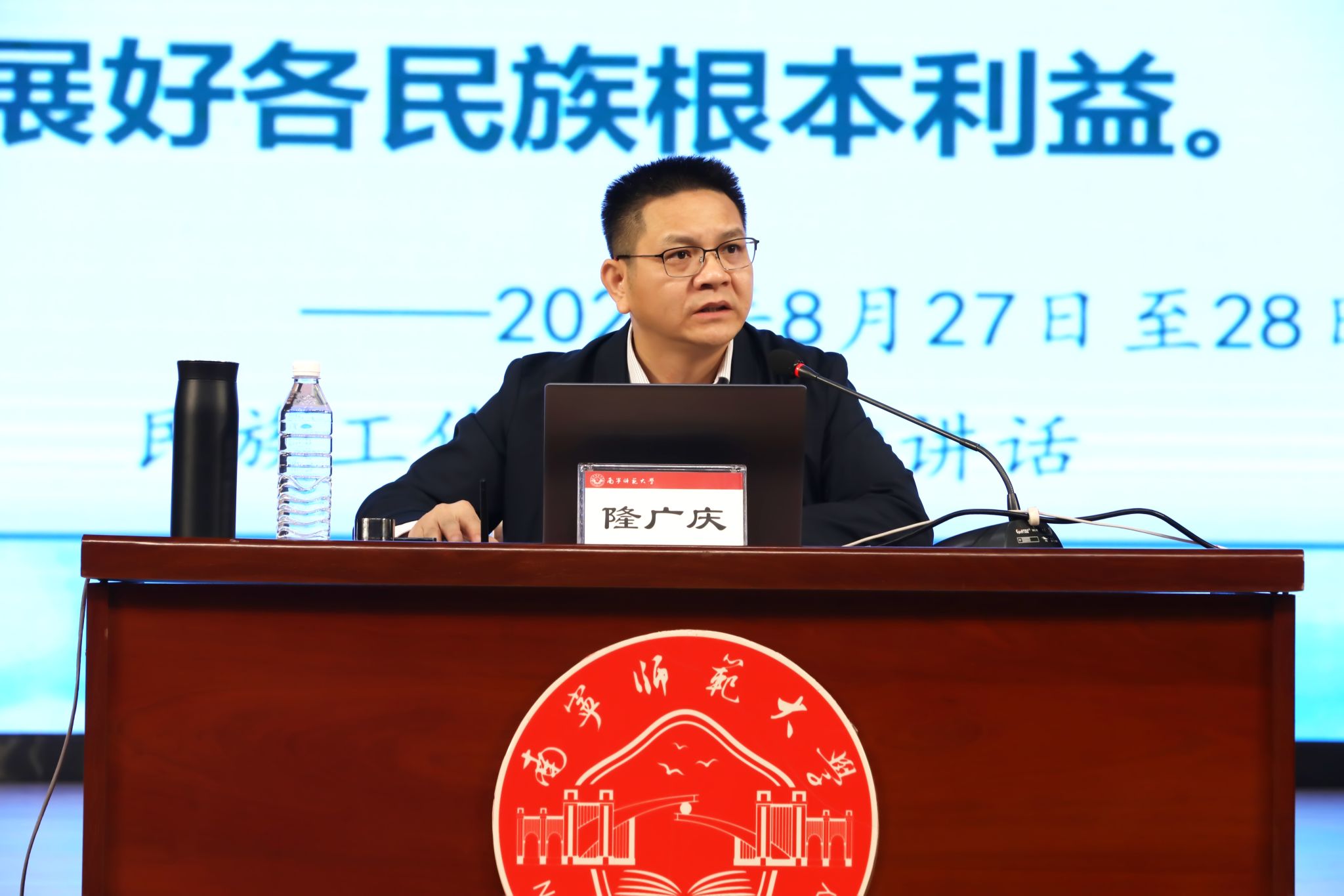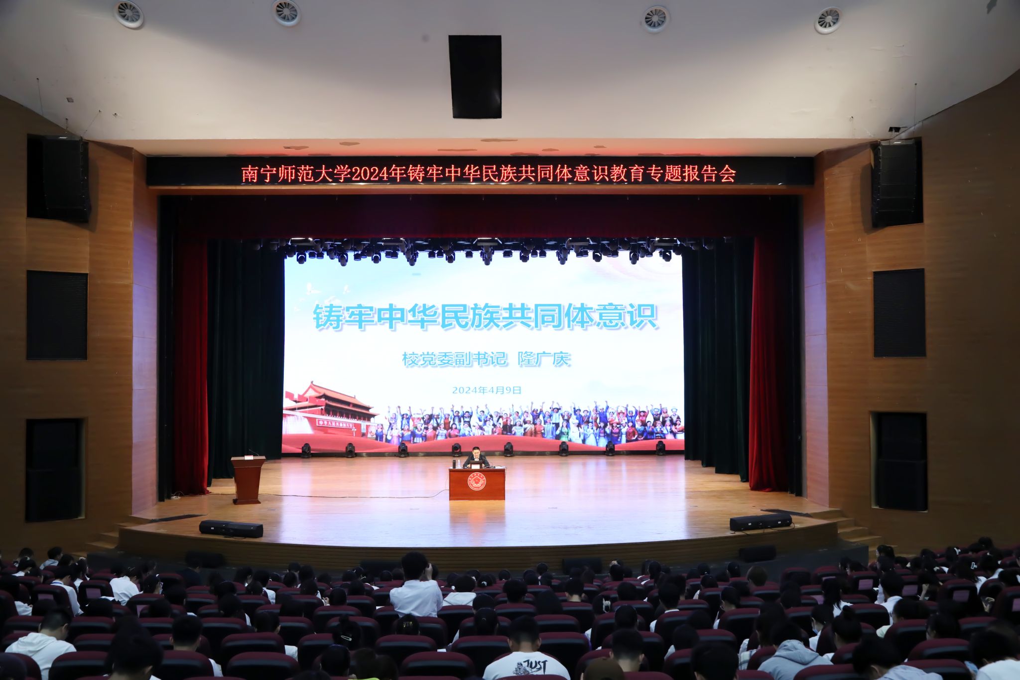 报告会上,隆广庆副书记以《铸牢中华民族共同体意识》为题,从党中央作出铸牢中华民族共同体意识重大决策部署的战略意义、铸牢中华民族共同体意识的丰富内涵、铸牢中华民族共同体意识的实践要求等三大方面,采用政策解读、案例视频等方式深入解读了为什么要铸牢中华民族共同体意识、铸牢哪些方面的意识、如何铸牢中华民族共同体意识。他指出,当今世界百年未有之大变局加速演进,中华民族伟大复兴进入关键时期。铸牢中华民族共同体意识的提出,是应对国内外一切风险挑战的重大决策部署,是维护国家统一、民族团结的必然要求,是强国建设、民族复兴的必由之路,具有十分重要的现实意义。他表示,习近平总书记关于铸牢中华民族共同体意识的一系列重要论述,具有深刻的理论内涵与实践指向,为新时代党的民族工作指明了前进方向,广大师生要做到增进“五个认同”、树立“四个共同”、根植“四个与共”、把握“四对关系”。他强调,要准确把握铸牢中华民族共同体意识的实践要求,全面推进中华民族共有精神家园建设,推动各民族共同走向社会主义现代化,促进各民族广泛交往交流交融,提升民族事务治理体系和治理能力现代化水平,防范民族领域重大风险隐患,讲好中华民族故事,大力宣介中华民族共同体意识。