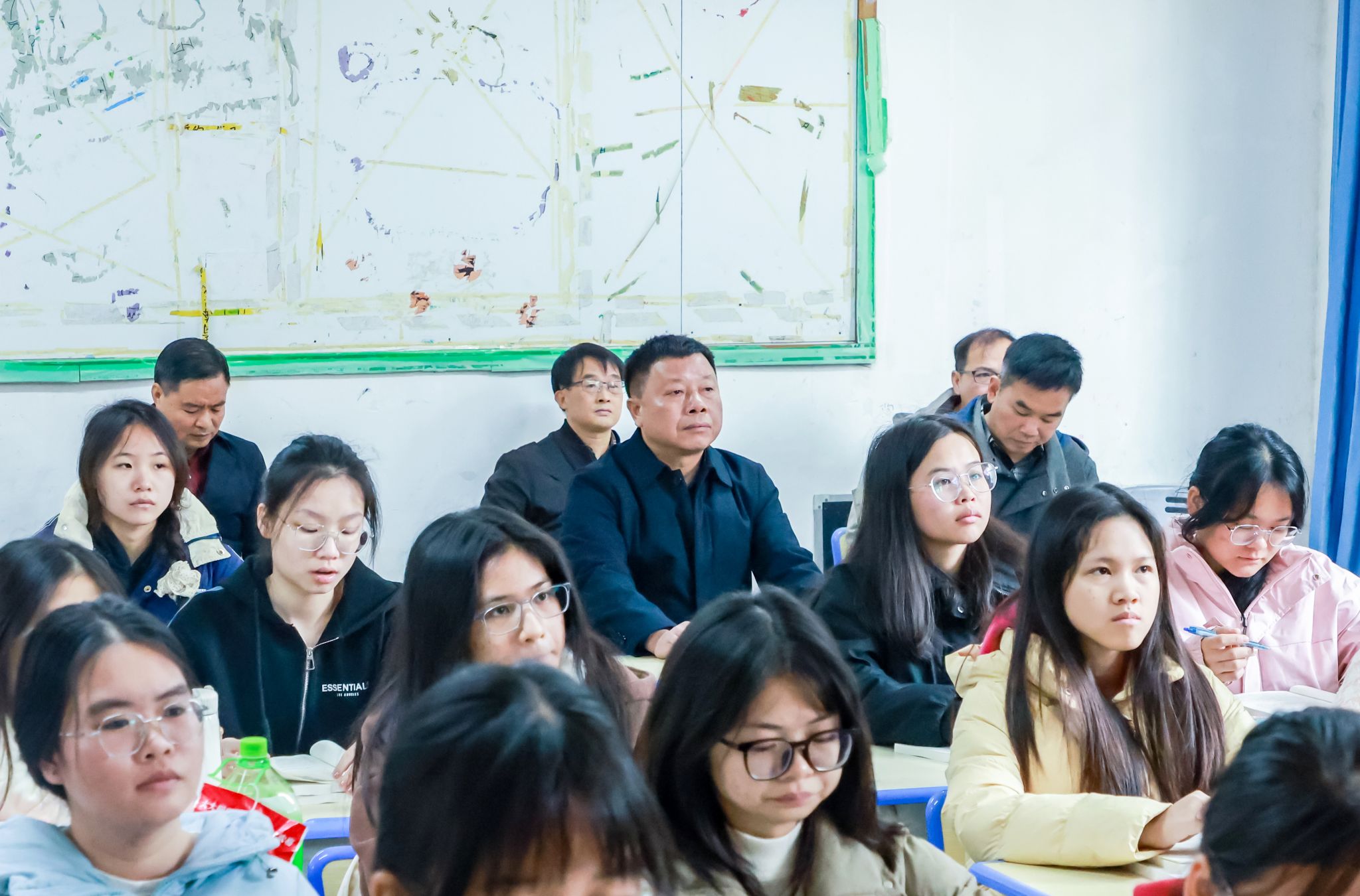 ▲校党委书记张鹏听课