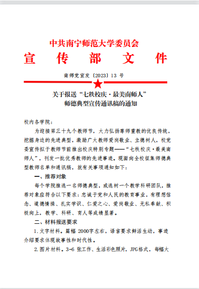 南师党宣发〔2023〕13号 关于报送“七秩校庆·最美南师人”师德典型宣传通讯稿的通知